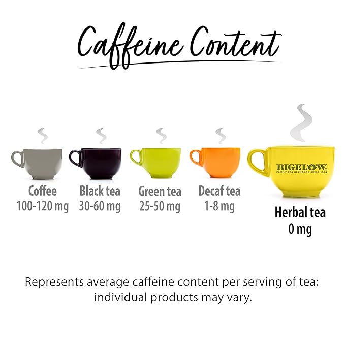 • Caffeine-free (0 mg; herbal). Bigelow’s Caff-O-Meter shows 0 mg for herbal teas.