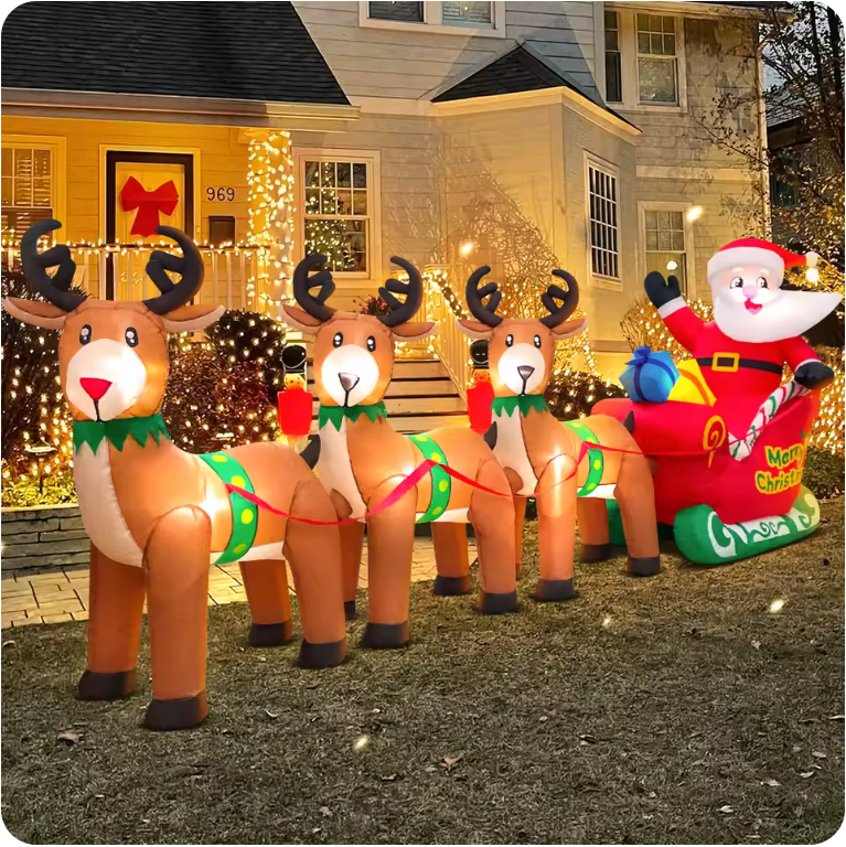 Available in multiple festive designs including Santa Claus on a sleigh, Festive arches, and more. Each inflatable features built-in LED lights that create a warm, glowing holiday atmosphere.