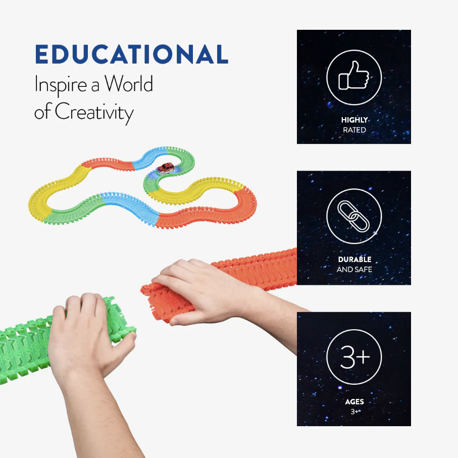 The included LED light-up race car adds even more excitement, zooming through each curve and bend with vibrant flashing lights. Kids can redesign the track over and over, creating endless combinations while exploring creativity, coordination, and imaginative play.