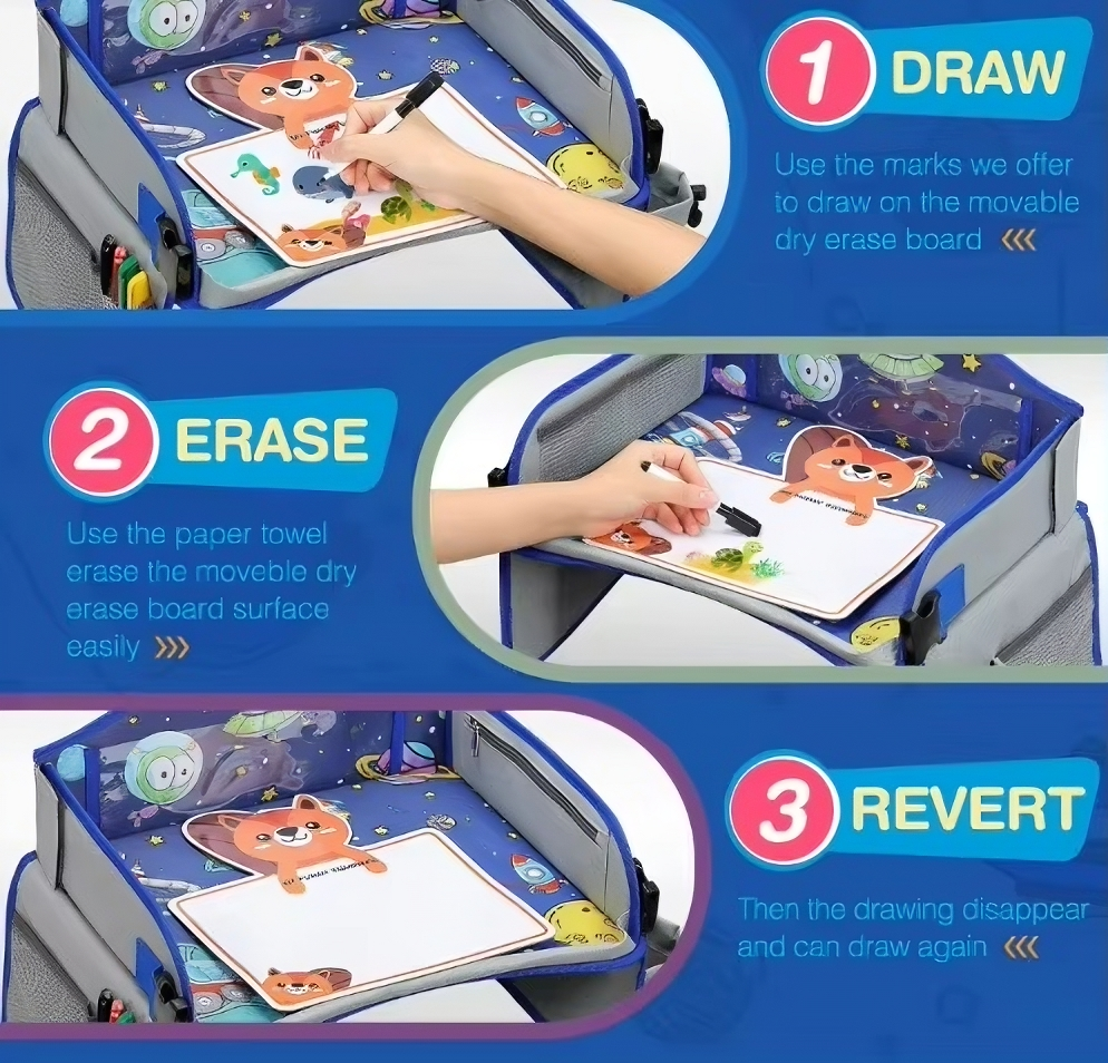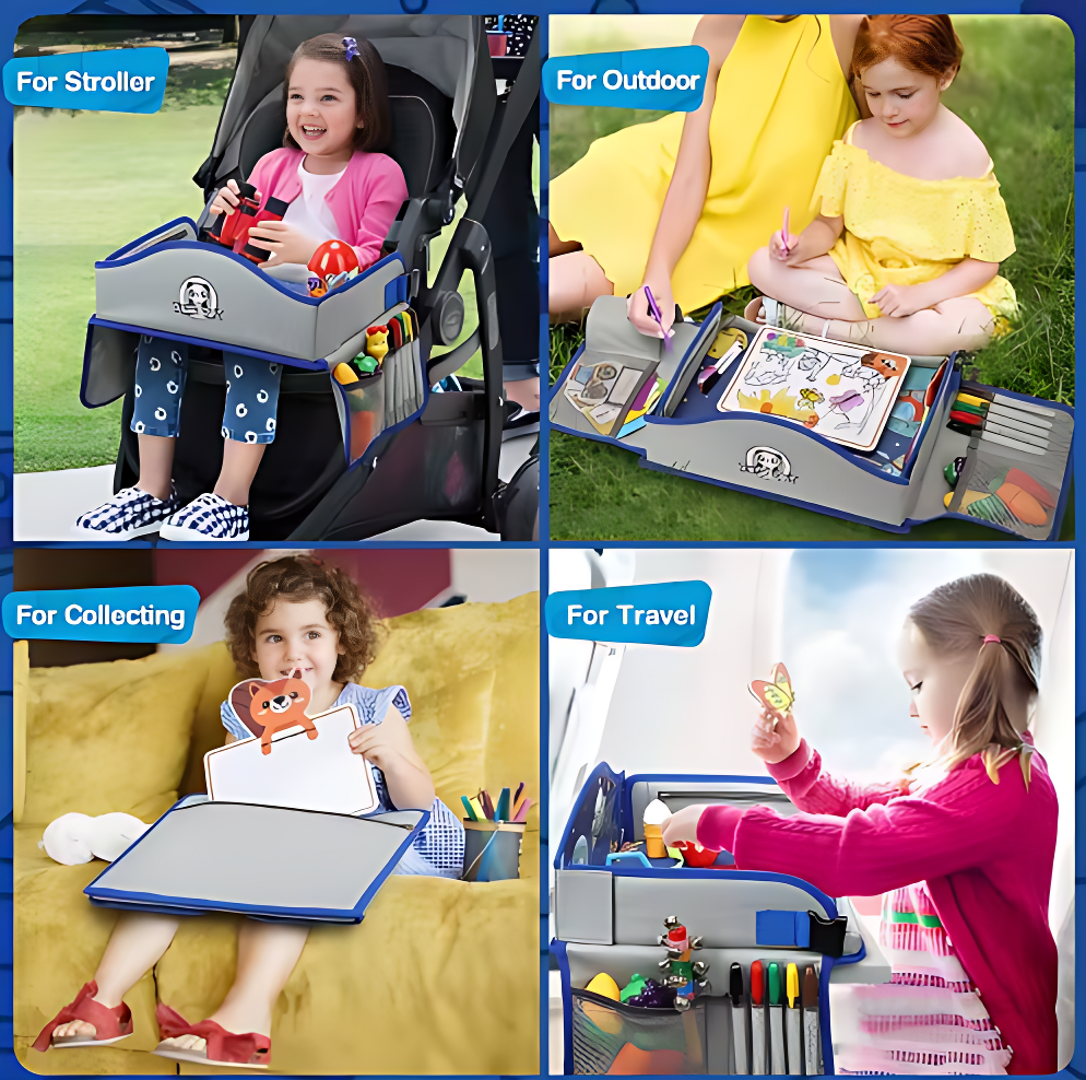 The raised edges prevent items from sliding off, while the spill-resistant, easy-to-clean surface ensures hassle-free maintenance. Lightweight and foldable, this travel tray is easy to carry and store — a must-have for road trips, flights, and daily commutes. Give your little one comfort, creativity, and convenience wherever you go!