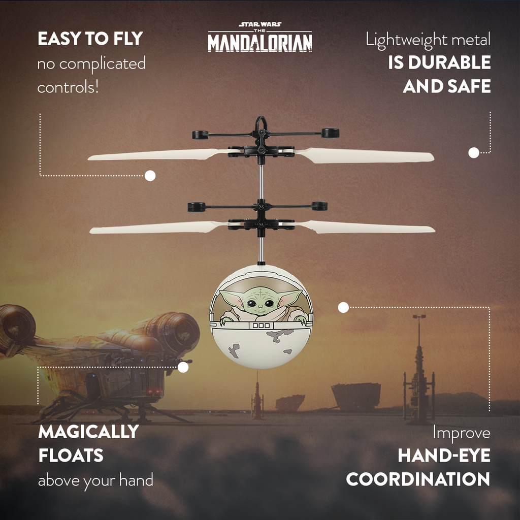 Watch as it flies over your hand for hand-eye coordination and motor skills! Baby Yoda is easy to fly and has no complicated controls, is made of lightweight metal is durable and safe.