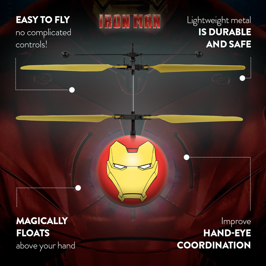Take off with the Marvel Avengers Iron Man IR UFO Ball Helicopter! Fly like Tony Stark himself with this officially licensed Marvel flying figure that brings Iron Man’s high-tech flight to life. Equipped with Motion Sense Technology, it detects your hand and hovers effortlessly above any surface — no remote required!