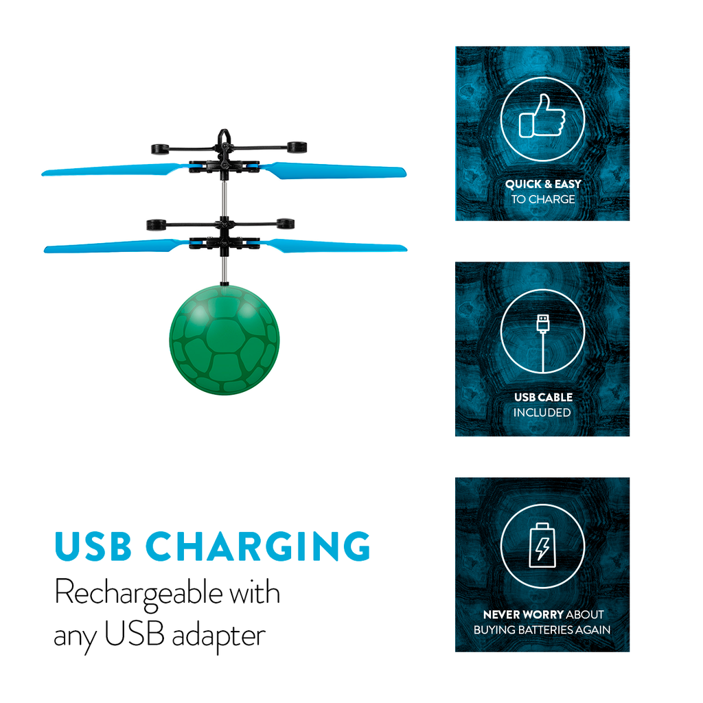 A quick 40-minute charge gives you 6–8 minutes of steady flight, and the included USB charging cable makes recharging fast and convenient. Cowabunga—get ready for high-flying ninja action!