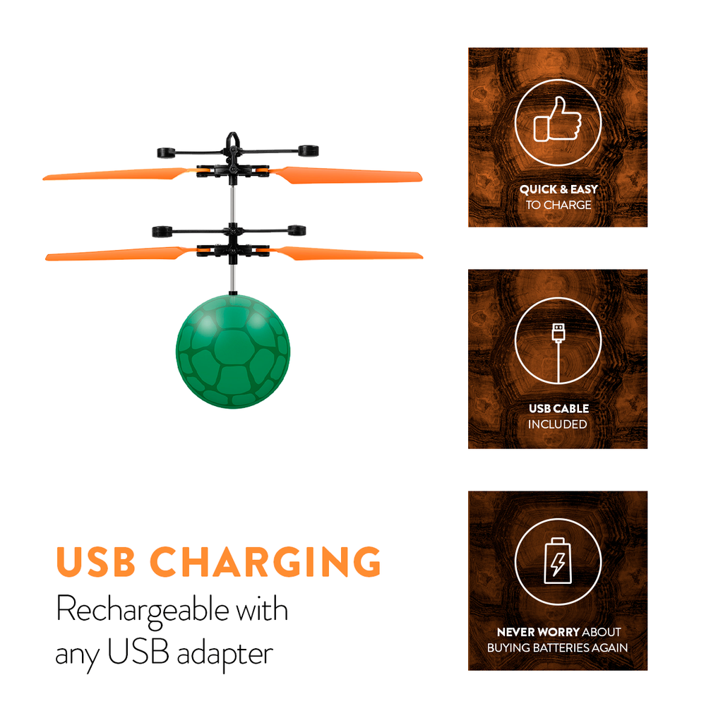 A quick 40-minute charge gives you 6–8 minutes of flight time, and the included USB charging cable makes recharging simple and convenient. Cowabunga—time to take Michelangelo airborne!