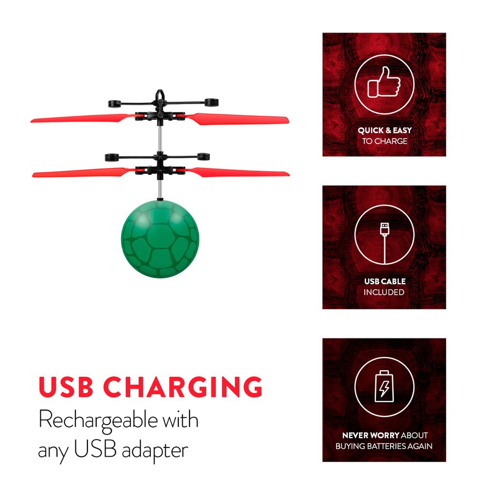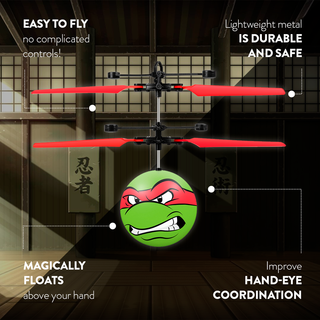 Take flight with your favorite Teenage Mutant Ninja Turtle! The Nickelodeon TMNT Raphael IR UFO Ball Helicopter brings the action of Raphael to life with motion-sense technology that keeps the helicopter hovering above your hand or any surface. Designed for fun and easy control, this officially licensed TMNT toy lets kids and fans enjoy interactive flight with smooth, stable performance.