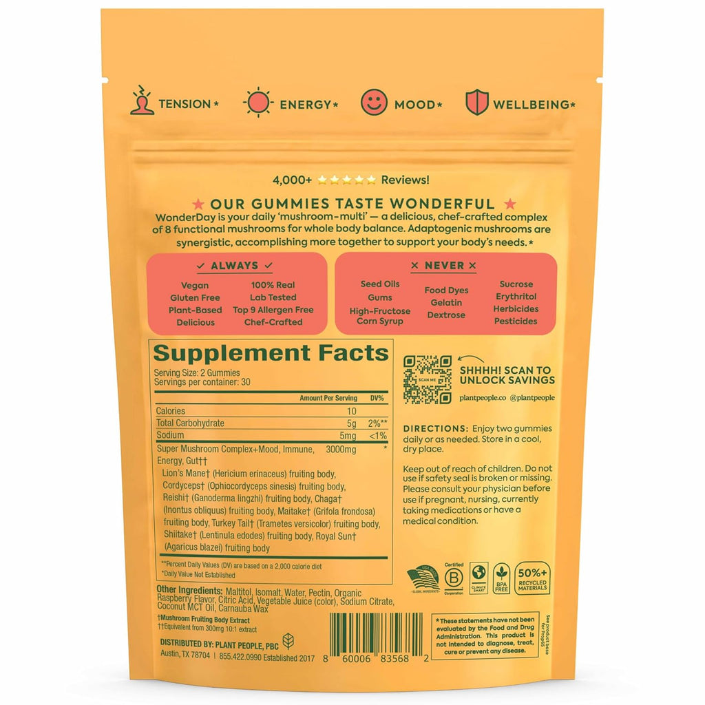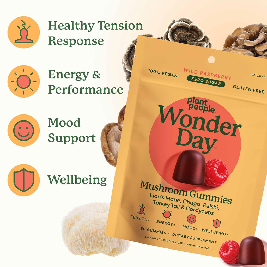 Start your day with a functional boost—without caffeine or sugar—with WonderDay Mushroom Gummies by Plant People. This doctor-formulated blend includes 10 powerful mushroom extracts designed to support energy, immune health, digestion, stress resilience, and cognitive clarity. All wrapped in a delicious wild raspberry flavor, these gummies are vegan, non-GMO, gluten-free, and made from 10:1 mushroom extracts, meaning each serving delivers the potency equivalent of 2,500 mg of whole mushrooms.