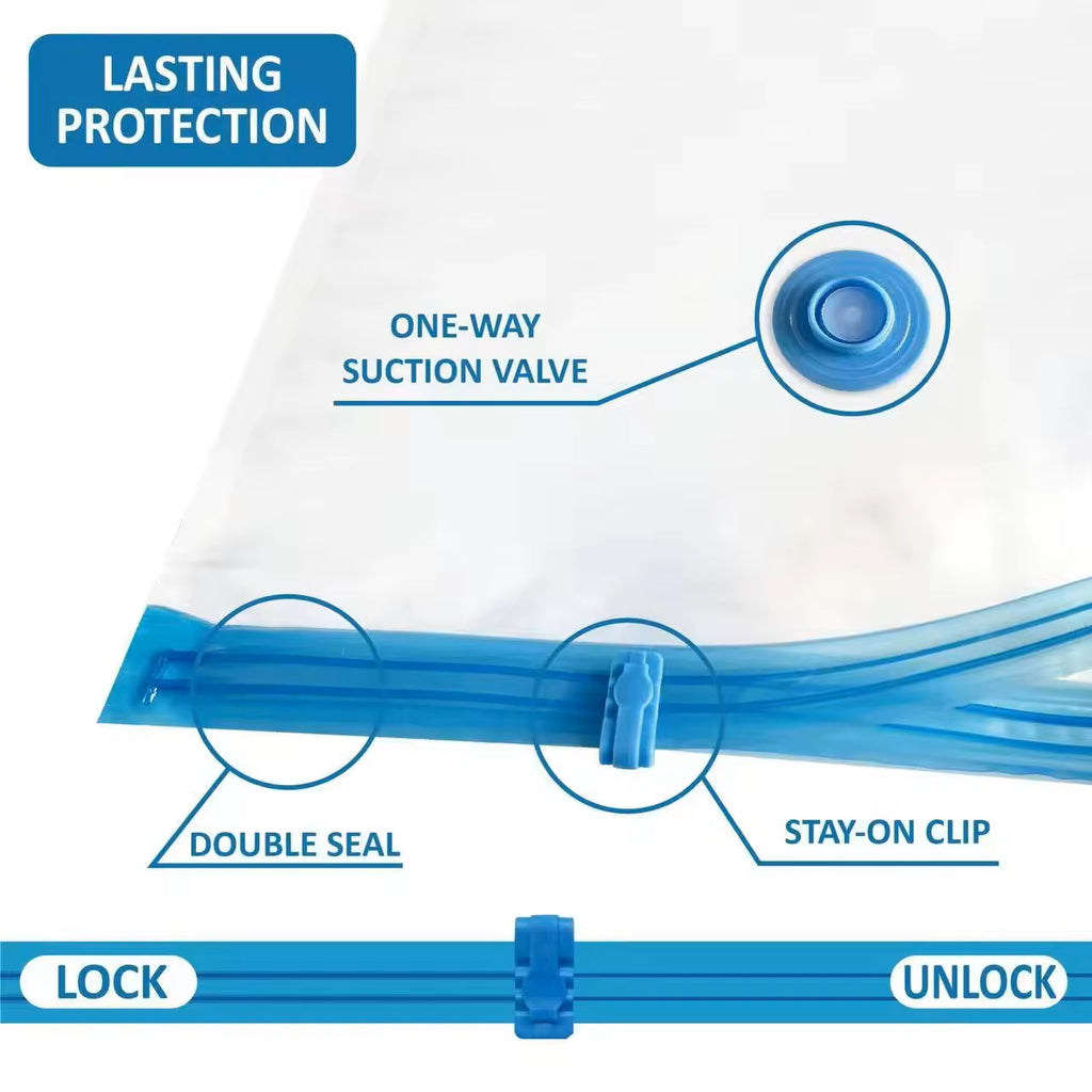 • Double-Zip Seal + Valve: Ensures airtight, leak-proof compression
